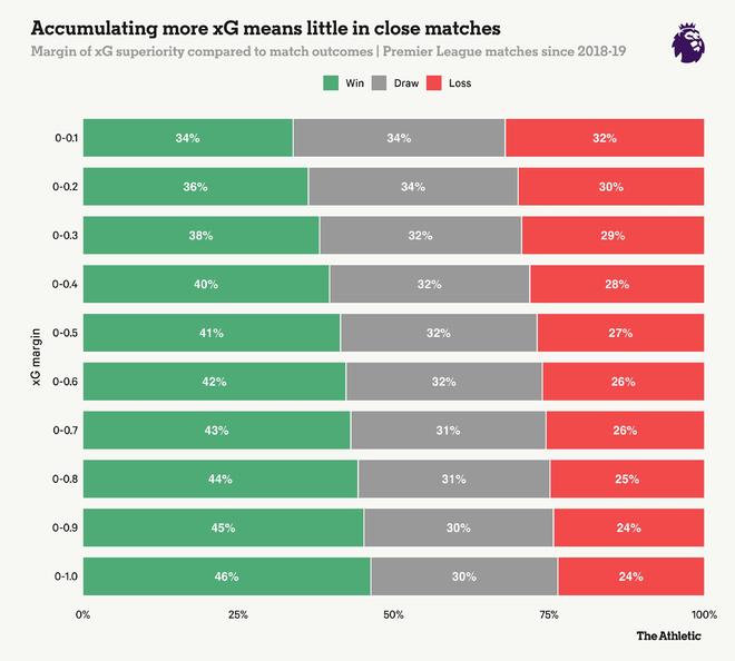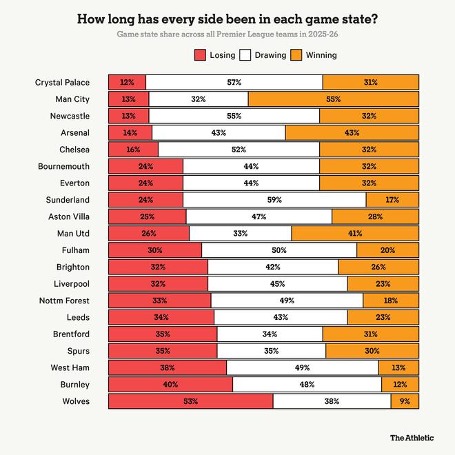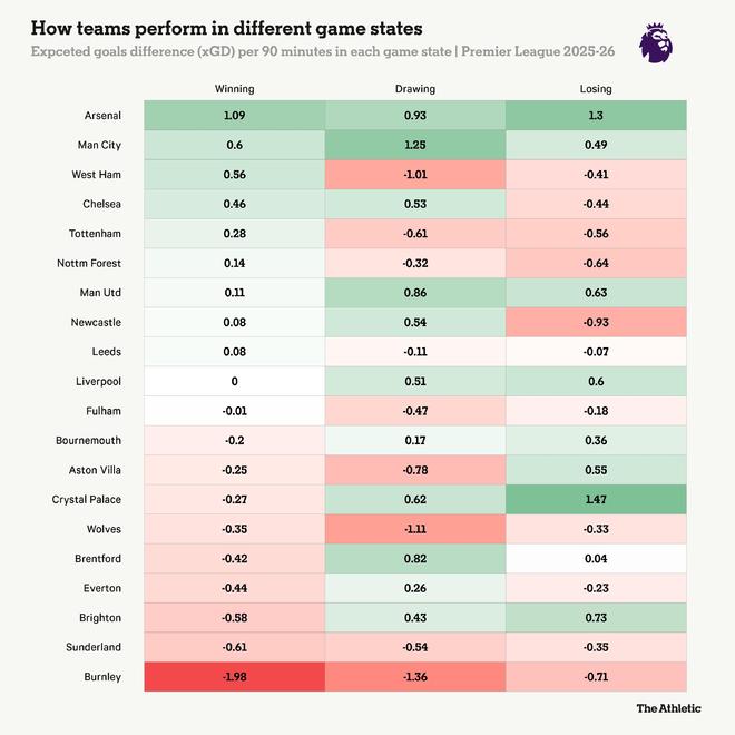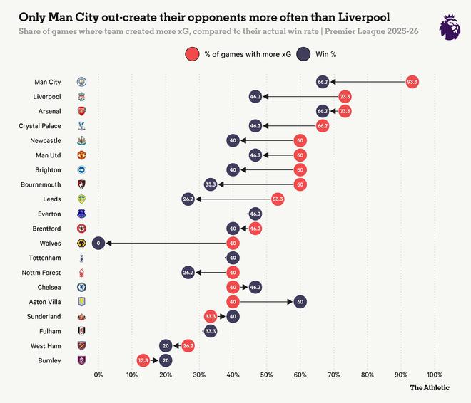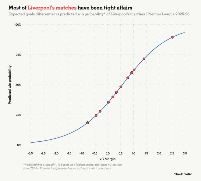近日,The Athletic发表专题文章,深入分析了利物浦本赛季在英超联赛中面临的核心矛盾:尽管球队在超过八成的比赛中创造了比对手更多的得分机会(预期进球值占优),且该项数据高居欧洲前列,其实际联赛排名却仅列第十,与榜首差距达十分。文章通过系统对比历史数据与比赛状态分析指出,利物浦的困境远非“运气不佳”可简单概括——球队在落后时攻防失衡的战术模式、关键局中微弱优势的转化乏力,以及与维拉等队面对逆境时截然不同的比赛控制力,共同揭示了其“得势难得分”的深层结构性症结。“很多时候,我们创造的机会都比我们让出的机会多,但最终结果却太多次是我们输掉了比赛,”利物浦主教练斯洛特在约一周前球队英超主场1-1战平桑德兰后,对《当日比赛》节目这样说道。斯洛特说得有道理。使用预期进球值——一种在射门前评估每次机会质量的指标——利物浦在本赛季21场英超和欧冠比赛中的17场(81%)都创造了比对手更多的机会。在欧洲五大联赛中,只有四支球队的占比更高:曼城、国际米兰、巴黎圣日耳曼和拜仁慕尼黑。这四支球队要么领跑各自国内联赛,要么距离榜首最多只差两分,然而斯洛特的球队排名第10,落后英超领头羊阿森纳10分。乍一看,利物浦似乎是一支成绩应该好得多的球队。他们能将困境仅仅归咎于运气不佳吗?斯洛特接下来的话补充了重要的背景,暗示着比运气不佳更深层次的问题。“今天,我们再次比他们创造了更多机会……顺便说一句,没有多那么多,只是稍微多一点,”他补充道。这个“稍微多一点”的限定语适用于利物浦本赛季大部分的英超比赛。实际上,他们比桑德兰多创造了1.03个xG,这是他们占优势时较大的差距之一,仅次于他们1-0战胜伯恩利(2.51个xG优势)和1-2主场负于曼联(1.41个xG优势)。但与其他联赛球队相比,这个xG优势稳稳处于中等水平。阿森纳有9场比赛的xG优势超过这个数值,而排名第二的曼城则有8次。这些优势幅度的大小很关键:社交媒体上经常充斥着球迷声称自己的球队应该赢,因为他们xG更高,但在势均力敌的比赛中,这几乎不能说明谁真正配得上积分。为了说明这一点,The Athletic研究了自2018-19赛季以来超过2800场英超比赛的xG差值,并将其与实际结果进行比较。当差值小于1时,xG更高的球队获胜的概率仅为46%,比抛硬币的概率还低。将差值进一步缩小到低于0.1的比赛,这几乎不能说明任何问题,记录更高xG的球队获胜概率仅高出两个百分点。但上图支持了一个前提,即更高的xG通常意味着更高的获胜概率。The Athletic利用这些英超比赛数据,模拟了不同xG差值下获胜概率的变化。xG差值在0.6左右是球队获胜概率开始超过不获胜概率的临界点,但利物浦本赛季15场英超比赛中,只有6场超过了这个阈值。将这些获胜概率相加,他们得到了7场“预期胜利”,与实际获胜场次相符。将这个模型应用于整个联赛,它对大多数球队都适用,阿斯顿维拉、桑德兰和狼队则属于特例。上表的排序与几家知名数据机构生成的预期积分排名大致吻合。这些有助于将利物浦的xG主导地位置于具体情境中,并解释为何这没有转化为更高的联赛排名。但这两种方法仍有缺陷,斯洛特在上周六3-3战平利兹联的赛前新闻发布会上,帮助说明了原因。“xG并不总能告诉你真实情况,”他说,“因为你在何时获得这些机会很重要;当你丢球后,与1-0或2-0领先时相比,你往往更开放。”利物浦本赛季有32%的英超比赛时间处于落后追赶状态,是曼城或阿森纳所占时间比例的两倍多。正如斯洛特指出的,这改变了他们的战术打法。下表显示了每支球队在领先、平局或落后时,其xG差值是如何变化的。利物浦在追赶比赛时最具威胁,平均每90分钟净xG为0.6,但这些时段通常会演变成混乱的对攻战。当他们落后时,进攻输出从每90分钟1.4 xG跃升至2.05 xG,但防守数据恶化,从0.89滑落至1.4。在他们有限的领先时段里,他们难以确立控制权,创造机会的速度与被对手创造机会的速度大致相当。与此同时,阿斯顿维拉在落后时数据与利物浦相似,但对比赛的控制要严密得多,将每90分钟的预期失球限制在仅0.84。这种额外的控制有助于防止分差扩大,并在一定程度上解释了为什么他们能从落后局面中抢回联赛领先的12分(7场比赛),而利物浦只抢回1分(同样7场比赛)。但运气也起了作用:维拉22个进球中有9个来自禁区外射门(这可能难以持续),且9场联赛胜利中有7场是1球小胜。他们典型的模式是,通过一次低xG的进攻取得领先,然后退守并承受压力,这拉低了他们的基础数据。只有在对手通过扳平或反超迫使他们提升表现时,他们才会提高比赛水平。可以将维拉的比赛效率与垫底的邻居狼队进行对比。狼队积累了大量“无效机会”——他们超过三分之一的xG来自落后两球或更多时,这有助于他们在xG榜单上支撑排名,但对于赢得实际积分作用有限。即使考虑了比赛状态背景,维拉本赛季也从未产生过高于1的xG差值,然而他们总能以微弱优势赢下那种利物浦会输掉的胶着比赛。利物浦将战绩不佳归咎于运气欠佳的说法,确实有一定的道理;但真正能够问鼎冠军的球队,往往从一开始就能够避免陷入这种胜负难料的焦灼对决。他们会凭借压倒性的比赛表现,让运气在胜负天平中沦为微不足道的配角,而非左右比赛结果的主角。【上咪咕独家看英超】
